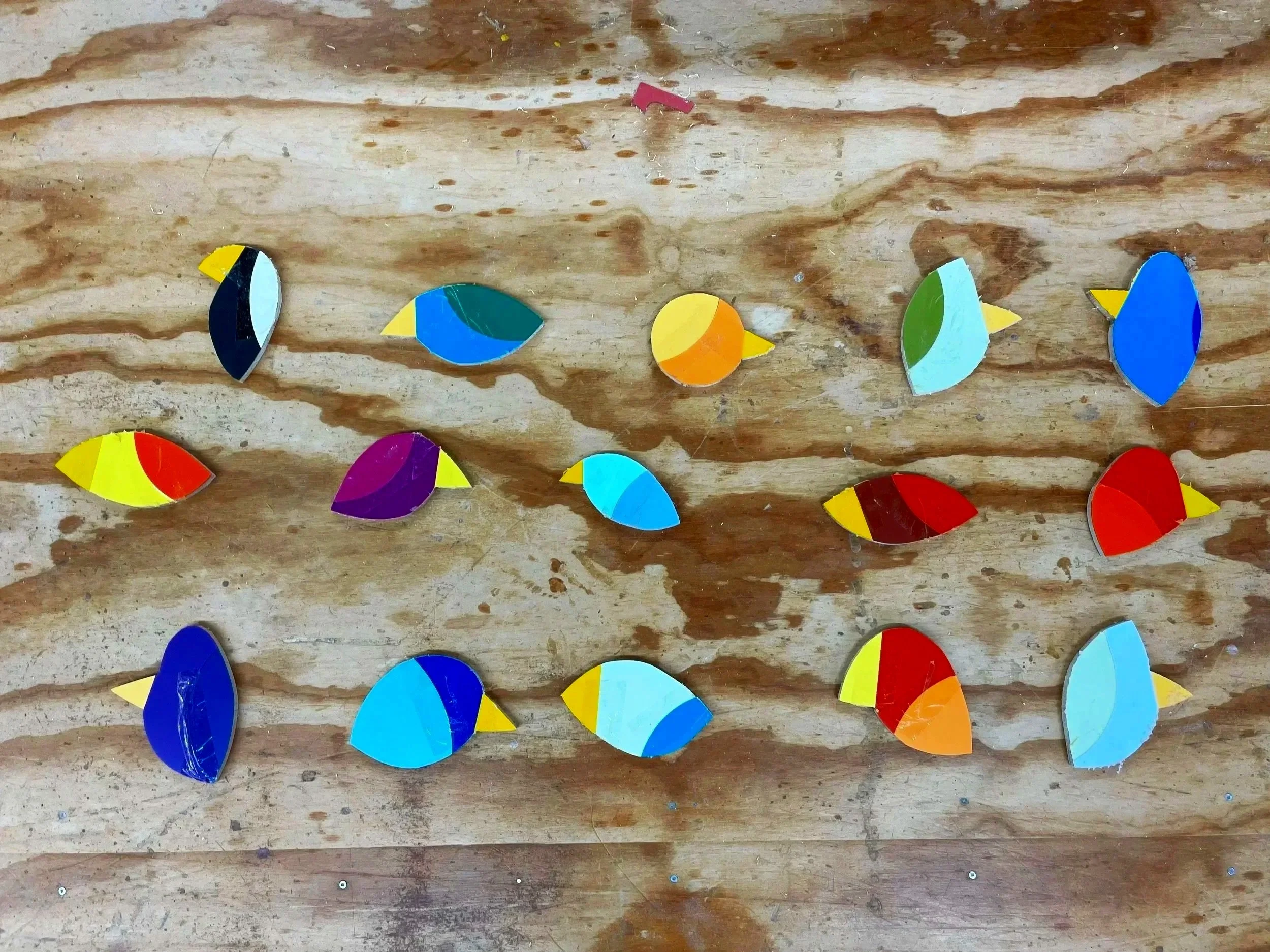 Birds of Ply is something fun I started making years ago from parts of art panels I made. While different sections of each panel would be scattered around the studio, some sections wouldn’t make it to the final process. These sections would be cut up on a massive bandsaw at The cabinet shop where I work. While cutting away I would make curves and follow certain scribed laminate lines. Each little cut out would look like different animals. Like seeing a face in a grain of wood or an image in a popcorn ceiling. The shapeof birds was most prominent. These sculptures are a small branch off of the many other thing I make.